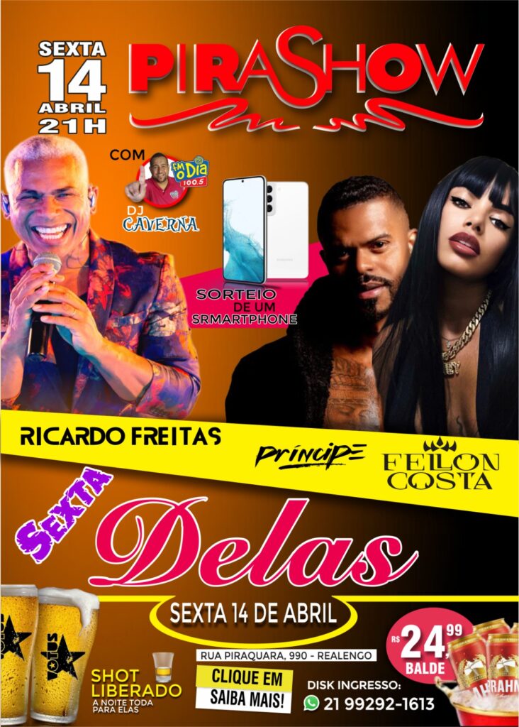 A PIRASHOW terá como atração de reinauguração o cantor queridinho das meninas PRÍNCIPE ,A linda e empoderada cantora FELLON COSTA , nova revelação do Funk ,e o cantor RICARDO FREITAS Dono de uma das músicas mais tocadas hoje nas Rádios “PRETA DOURADA”, e encerrando a noite o DJ mais querido da Fm O Dia DJ CAVERNA quebrando tudo…